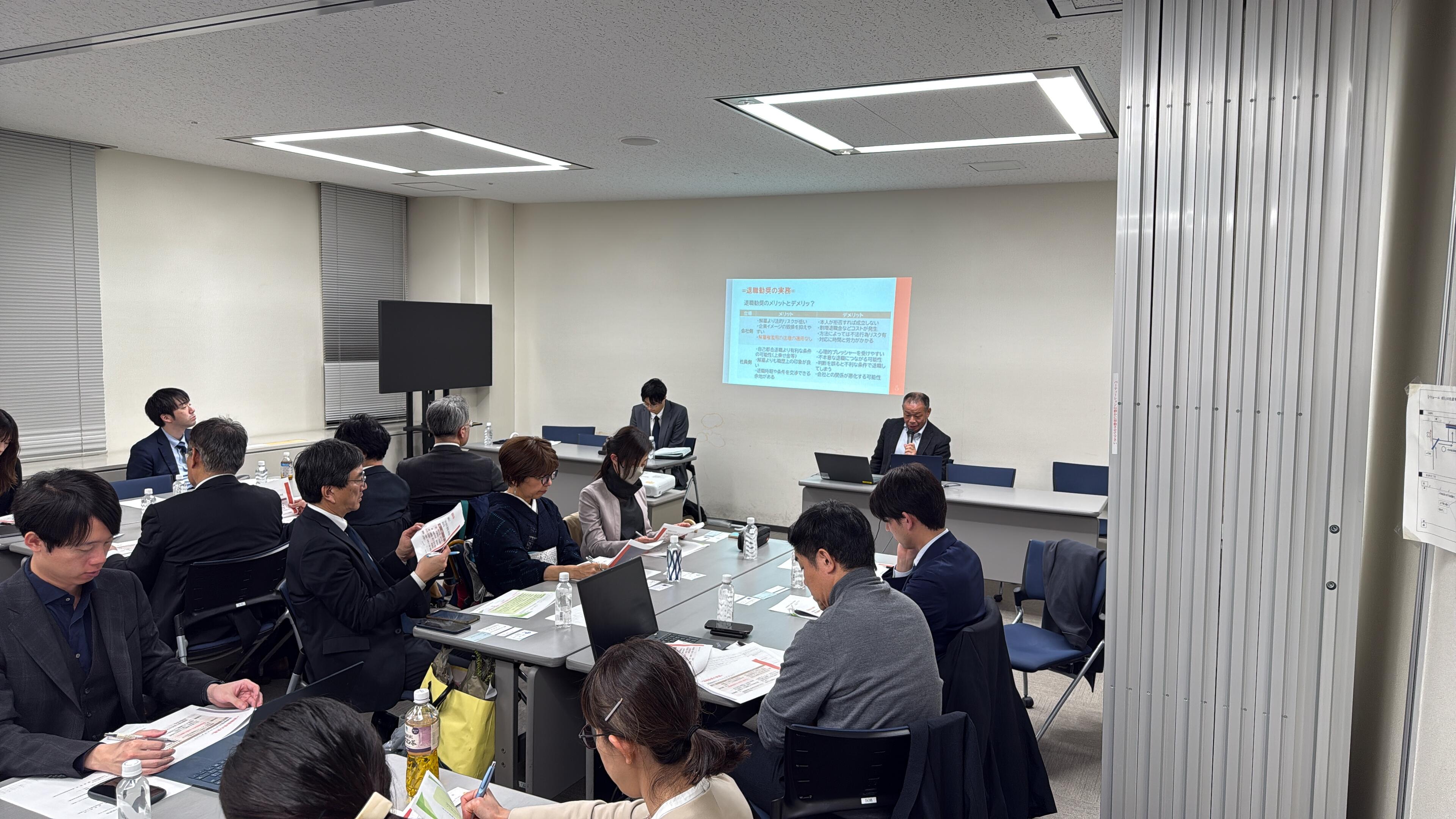 第1部では、木村秀平弁護士(中小企業法律支援センター委員)が、「退職勧奨に関する法的問題」というテーマで、退職勧奨に関する法的な諸問題について解説いたしました。続いて、賃金制度研究会所属の大田恭生社会保険労務士より、「退職勧奨の実務について」というテーマで、社会保険労務士の立場から退職勧奨に関する実務上の対応や留意点について、大田先生のご経験を交えつつ解説して頂きました。
