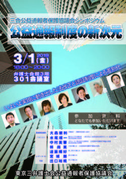 東京三弁護士会公益通報者保護協議会は、シンポジウム「公益通報制度の新次元~いよいよ実現に動き出した法改正と認証制度による差別化~」を3月1日(金)に開催します。