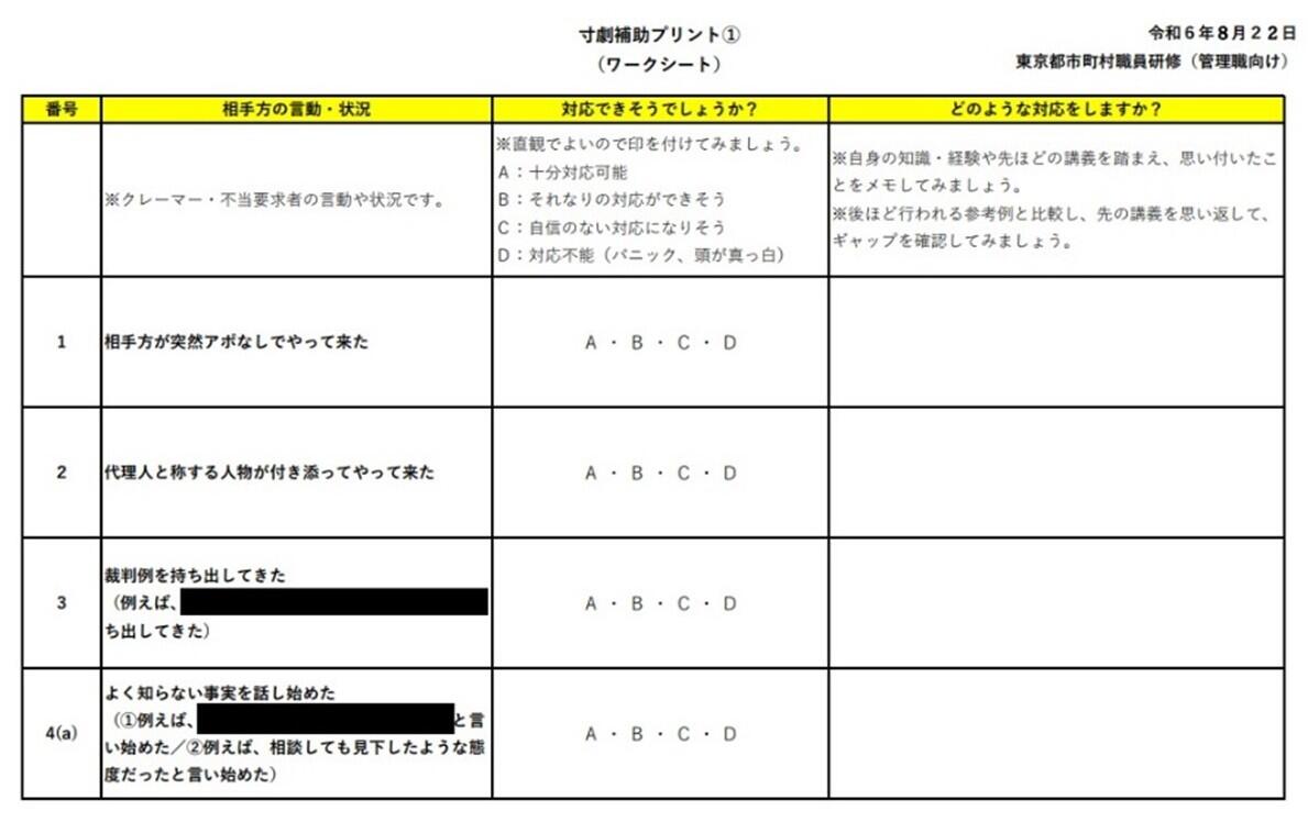 研修では、不当要求対応の基調講演、寸劇による不当要求対応への実践、質疑応答を通じて管理職の方向けに実践的な研修を行いました。寸劇では、「A市側の生活保護費の支給ミスをきっかけとした不当要求」という架空のケースを想定し、具体的かつリアルな場面設定での、不当要求対応をテーマに扱いました。さらにワークシート(下記)を用いて、受講生の方に積極的に参加してもらい、より実践的な対応をお伝えしました。