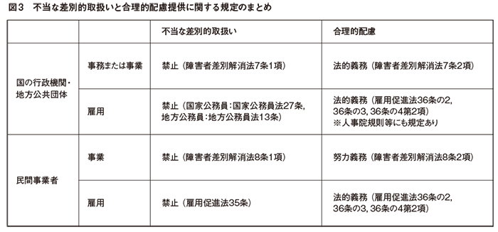 ただし,障害者差別解消法と同時期に改正された障害者の雇用の促進等に関する法律(以下「雇用促進法」という)の34条,35条,36条の2,36条の3において,事業者は,労働者の募集・採用においては均等な機会を与えることが求められ,採用後においては賃金その他の待遇に関して不当な差別的取扱いが禁止され,合理的配慮に関しては,募集・採用においては障害者の申出により,採用後は申出がなくてもこれを提供しなければならないとされている(図3)。